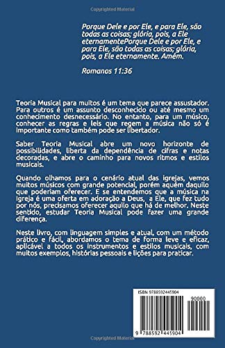 Este livro é para aqueles que querem aprender música de forma fácil e rápida, com um método comprovadamente eficaz, com linguagem simples e atual, exemplos práticos e lições para praticar. O livro aborda conceitos teóricos e práticos, aplicáveis a qualquer estilo e instrumento musical, apresentando de conceitos básicos a avançados, não sendo necessário nenhum conhecimento prévio. O livro acompanha vídeo aulas online gratuitas com explicações dos conceitos apresentados. Além do conteúdo de teoria musical, para apoiar o aprendizado, em cada capítulo é apresentado um ensino bíblico que nos mostra como aprender música pode ser benéfico para o Louvor a Deus nas igrejas